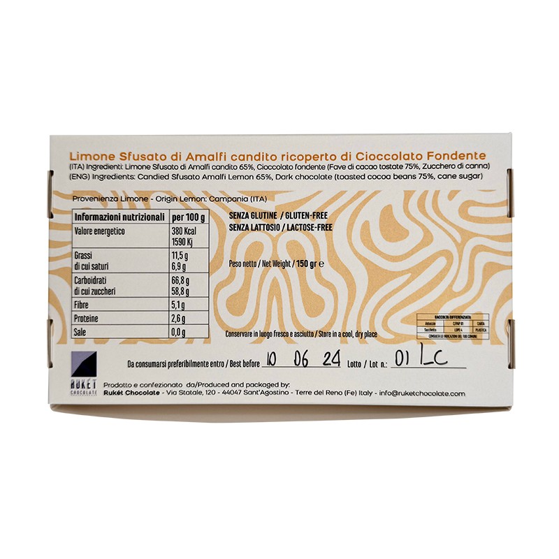 limone sfusato di Amalfi candito 65%, cioccolato fondente (fave di cacao tostate 75%, zucchero di canna)